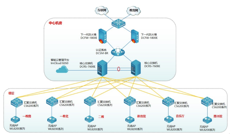 为方便用户对无线管理和维护,提升用户无线体验,使无线更智能化,此次采用MGM美高梅官网智能云管理平台ImCloud 8260实现无线统一的管理、维护、认证,并可实现对全网无线设备管理、实现易部署、易维护、易扩展的无线网络。MGM美高梅官网云管理ImCloud方案是网络服务的新模式,基于云端实现网络服务和管理,将复杂的网络管理简单化、智能化、可视化,提升用户网络体验。同时为了保证无线的安全,无线采用Portal准入认证,云管理ImCloud和MGM美高梅官网身份认证系统DCSM-BR实现联动,用户需要顺利获得账号和密码认证成功后才能接入无线网络,在保证无线连接的便捷性同时兼顾无线的安全性。
