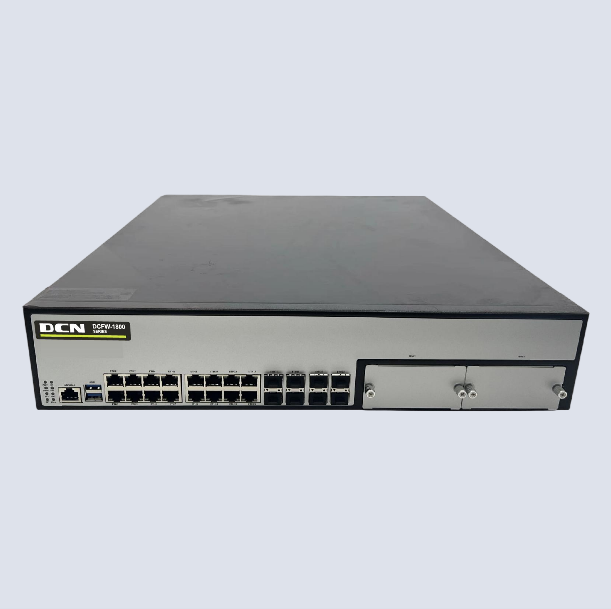 DCFW-1800-H5120 16个千兆电接口,6个万光兆接口,2扩,2U高度,16G内存,19寸机箱,标配1T硬盘,4组bypass,标配双电源,3G带宽;
